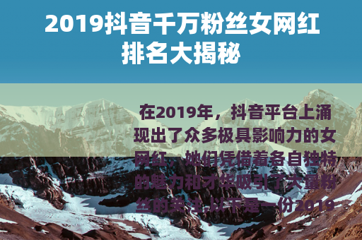 在2019年,抖音平台上涌现出了众多极具影响力的女网红,她们凭借着各自独特的魅力和才华吸引了大量粉丝的关注,以下是一份2019抖音千万粉丝女网红的排名情况。
