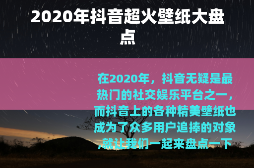 在2020年,抖音无疑是最热门的社交娱乐平台之一,而抖音上的各种精美壁纸也成为了众多用户追捧的对象,就让我们一起来盘点一下那些在2020年抖音上最火的壁纸吧。