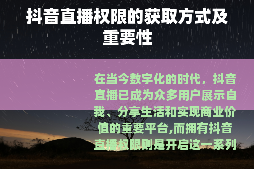 在当今数字化的时代,抖音直播已成为众多用户展示自我、分享生活和实现商业价值的重要平台,而拥有抖音直播权限则是开启这一系列精彩可能的关键钥匙。