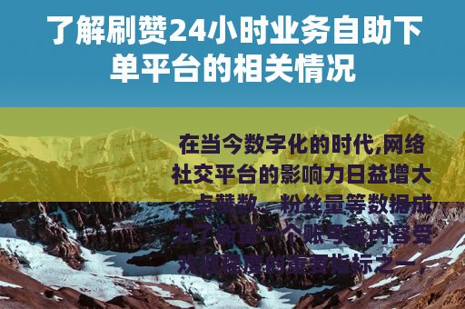 在当今数字化的时代,网络社交平台的影响力日益增大,点赞数、粉丝量等数据成为了衡量一个账号或内容受欢迎程度的重要指标之一,刷赞24小时业务自助下单平台应运而生,为许多希望快速提升自己账号数据的人提供了一种看似便捷的途径。