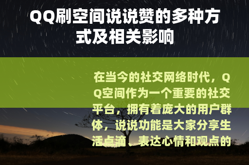 在当今的社交网络时代,QQ空间作为一个重要的社交平台,拥有着庞大的用户群体,说说功能是大家分享生活点滴、表达心情和观点的重要途径,而说说赞则成为了衡量一条说说受欢迎程度的重要指标之一,许多人都希望自己的说说能够获得更多的赞,以展示自己的人气和影响力,QQ刷空间说说赞这一现象便应运而生。