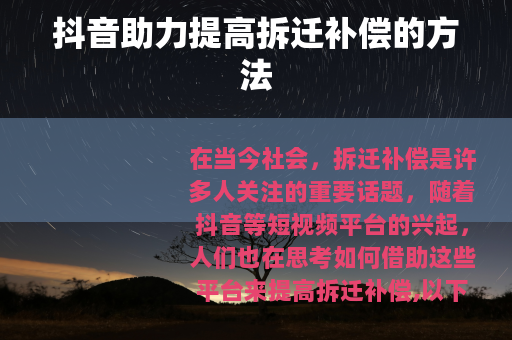 在当今社会,拆迁补偿是许多人关注的重要话题,随着抖音等短视频平台的兴起,人们也在思考如何借助这些平台来提高拆迁补偿,以下是一些在抖音上可以尝试的方法。