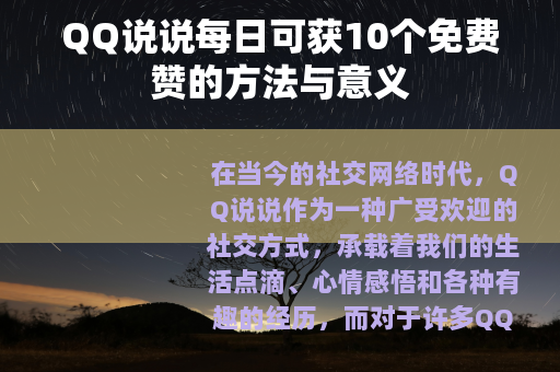 在当今的社交网络时代,QQ说说作为一种广受欢迎的社交方式,承载着我们的生活点滴、心情感悟和各种有趣的经历,而对于许多QQ用户来说,自己发布的说说能够获得他人的点赞,无疑是一件令人开心和满足的事情,QQ说说每日10个免费赞的存在,更是为我们的社交生活增添了一份别样的乐趣。