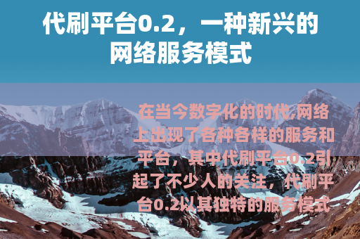 在当今数字化的时代,网络上出现了各种各样的服务和平台,其中代刷平台0.2引起了不少人的关注,代刷平台0.2以其独特的服务模式和相对较低的价格,在网络世界中逐渐崭露头角。