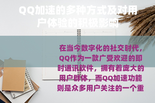在当今数字化的社交时代,QQ作为一款广受欢迎的即时通讯软件,拥有着庞大的用户群体,而QQ加速功能则是众多用户关注的一个重要方面,它为用户带来了诸多便利和独特的体验。