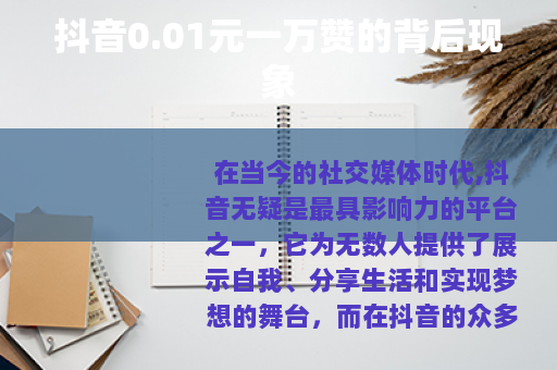 在当今的社交媒体时代,抖音无疑是最具影响力的平台之一,它为无数人提供了展示自我、分享生活和实现梦想的舞台,而在抖音的众多现象中,有一种情况引起了广泛的关注,那就是所谓的抖音0.01元一万赞。