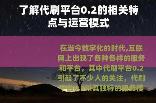 在当今数字化的时代,互联网上出现了各种各样的服务和平台,其中代刷平台0.2引起了不少人的关注,代刷平台0.2以其独特的服务模式在网络世界中占据了一席之地。