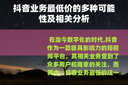在当今数字化的时代,抖音作为一款极具影响力的短视频平台,其相关业务受到了众多用户和商家的关注,而其中,抖音业务最低价这一话题更是引发了广泛的讨论和探索。