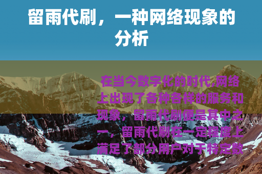 在当今数字化的时代,网络上出现了各种各样的服务和现象,留雨代刷便是其中之一,留雨代刷在一定程度上满足了部分用户对于特定数据增长或任务完成的需求。