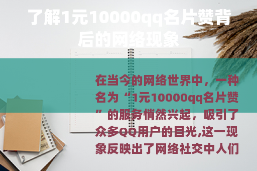 在当今的网络世界中,一种名为“1元10000qq名片赞”的服务悄然兴起,吸引了众多QQ用户的目光,这一现象反映出了网络社交中人们对于虚拟形象和关注度的追求。