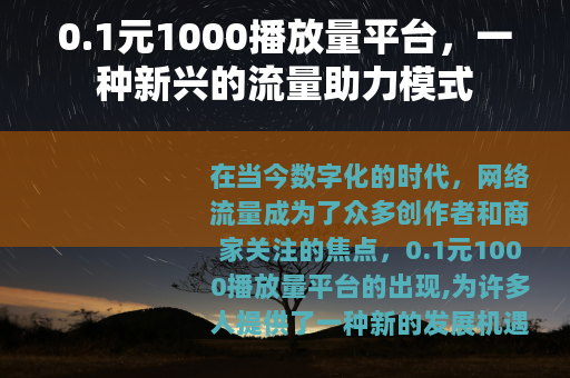 在当今数字化的时代,网络流量成为了众多创作者和商家关注的焦点,0.1元1000播放量平台的出现,为许多人提供了一种新的发展机遇。
