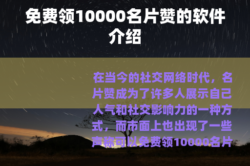在当今的社交网络时代,名片赞成为了许多人展示自己人气和社交影响力的一种方式,而市面上也出现了一些声称可以免费领10000名片赞的软件,吸引了众多用户的目光。