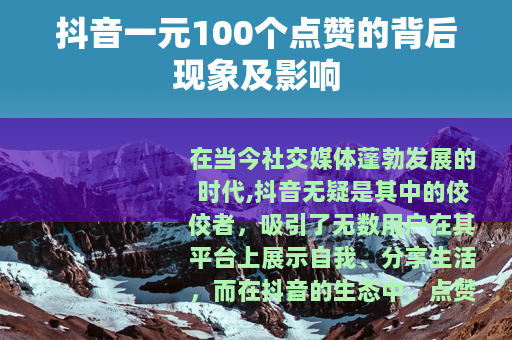 在当今社交媒体蓬勃发展的时代,抖音无疑是其中的佼佼者,吸引了无数用户在其平台上展示自我、分享生活,而在抖音的生态中,点赞数量成为了衡量一个视频受欢迎程度的重要指标之一,一种奇特的现象应运而生,那就是所谓的“抖音一元100个点赞”的服务在一些角落里悄然出现。