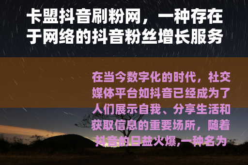 在互联网的世界里,抖音以其独特的魅力吸引了数以亿计的用户,成为了人们生活中不可或缺的一部分,而卡盟抖音刷粉网也在这个背景下悄然出现,成为了一些用户试图提升自己在抖音平台上地位的一种手段。