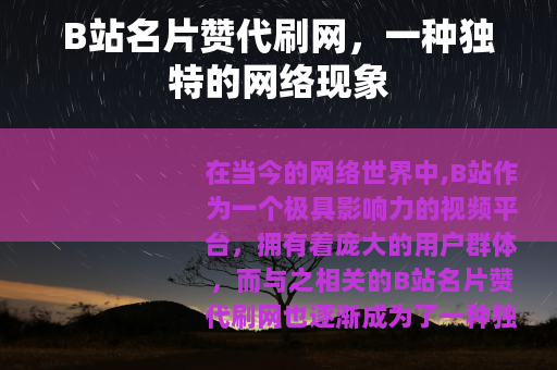 在当今的网络世界中,B站作为一个极具影响力的视频平台,拥有着庞大的用户群体,而与之相关的B站名片赞代刷网也逐渐成为了一种独特的网络现象。
