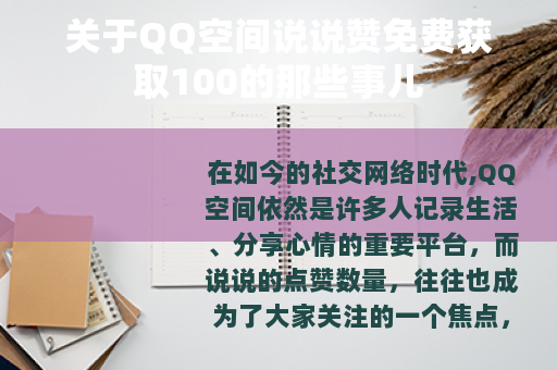 在如今的社交网络时代,QQ空间依然是许多人记录生活、分享心情的重要平台,而说说的点赞数量,往往也成为了大家关注的一个焦点,它在一定程度上代表着自己的人气和所发内容的受欢迎程度,QQ空间说说赞免费100这个话题,更是引起了不少人的兴趣。