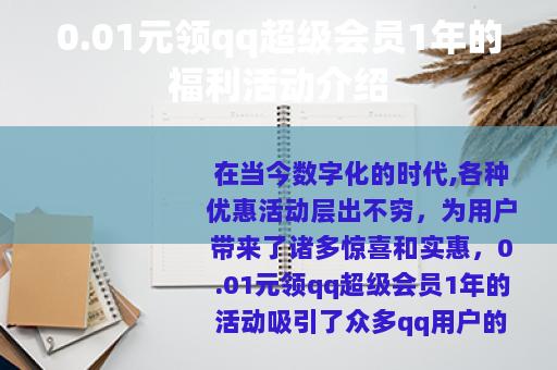 在当今数字化的时代,各种优惠活动层出不穷,为用户带来了诸多惊喜和实惠,0.01元领qq超级会员1年的活动吸引了众多qq用户的目光。