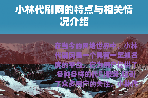 在当今的网络世界中,小林代刷网是一个具有一定知名度的平台,它为用户提供了各种各样的代刷服务,吸引了众多用户的关注。