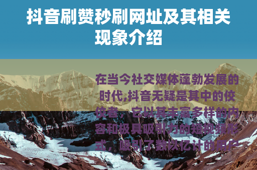 在当今社交媒体蓬勃发展的时代,抖音无疑是其中的佼佼者,它以其丰富多样的内容和极具吸引力的短视频形式,吸引了数以亿计的用户,而在抖音的生态中,点赞量成为了衡量一个视频受欢迎程度的重要指标之一,这也使得一些人开始关注所谓的抖音刷赞秒刷网址。