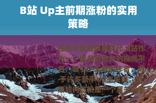在当今的互联网时代,B站作为一个极具影响力的视频平台,吸引了无数创作者,对于许多新手Up主来说,前期如何涨粉是一个至关重要的问题,以下是一些有效的方法,可以帮助B站 Up主在前期实现粉丝量的增长。 质量是关键,要制作出有吸引力的视频,就需要深入了解自己的目标受众,明确他们的兴趣和需求,无论是搞笑、游戏、知识科普还是生活记录等各种类型的视频,都要确保内容具有独特性和价值,如果你擅长游戏,那么可以制作精彩的游戏攻略、搞笑的游戏实况等视频,让观众在观看后能有所收获,如学到新的游戏技巧或获得快乐。