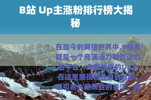 在当今的网络世界中,B站无疑是一个充满活力和创造力的平台,众多优秀的Up主在这里展现着各自的才华,吸引着大量粉丝的关注,而了解B站 Up主涨粉排行榜,对于很多人来说,无论是普通观众还是有志于在B站发展的创作者,都有着重要的意义。