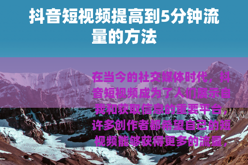 在当今的社交媒体时代,抖音短视频成为了人们展示自我和获取信息的重要平台,许多创作者都希望自己的短视频能够获得更多的流量,尤其是当视频时长达到5分钟时,如何提高流量成为了一个关键问题。 的质量是至关重要的,要确保视频内容有吸引力、有价值且具有独特性,可以从用户的兴趣点出发,选择热门话题进行创作,如美食制作、旅行攻略、时尚穿搭等,通过精心策划和拍摄,为观众呈现出高质量的视觉和听觉体验。