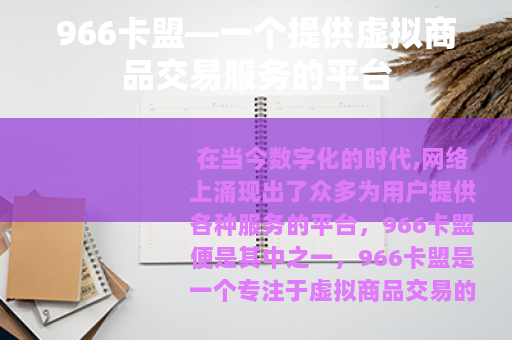 在当今数字化的时代,网络上涌现出了众多为用户提供各种服务的平台,966卡盟便是其中之一,966卡盟是一个专注于虚拟商品交易的在线平台,它为广大用户搭建了一个便捷的交易桥梁。