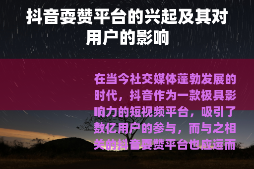 抖音耍赞平台作为抖音生态中的一个特殊存在,既有其积极的一面,也有其需要注意的问题,对于用户来说,应该理性看待抖音耍赞平台,将其作为一种辅助手段,而不是主要的发展策略,在利用其提升点赞数的同时,更要注重自身创作能力的提升和内容质量的优化,这样才能在抖音平台上获得真正的成功和发展,只有在保证内容质量的基础上,合理利用抖音耍赞平台等工具,才能实现抖音平台的健康、可持续发展,让更多优秀的创作者和作品脱颖而出,为用户带来更多的价值和乐趣。 你能满意,你也可以提出更多具体的修改意见和要求,我会继续为你完善。