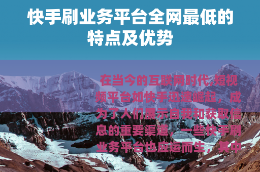 在当今的互联网时代,短视频平台如快手迅速崛起,成为了人们展示自我和获取信息的重要渠道,一些快手刷业务平台也应运而生,其中以全网最低价格著称的平台更是吸引了众多用户的目光。