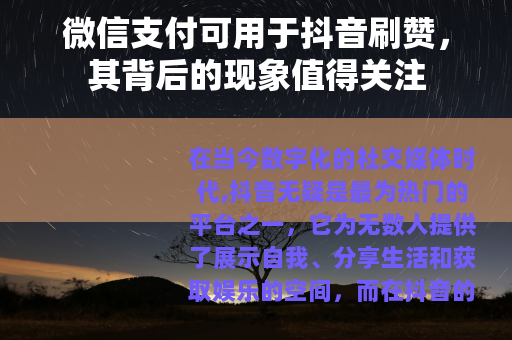在当今数字化的社交媒体时代,抖音无疑是最为热门的平台之一,它为无数人提供了展示自我、分享生活和获取娱乐的空间,而在抖音的生态中,点赞数成为了衡量一个视频受欢迎程度的重要指标之一,一种围绕抖音刷赞的现象逐渐兴起,其中微信支付作为一种常用的支付方式也参与其中。