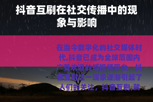 在当今数字化的社交媒体时代,抖音已成为全球范围内广受欢迎的短视频平台,抖音互刷这一现象逐渐引起了人们的关注。