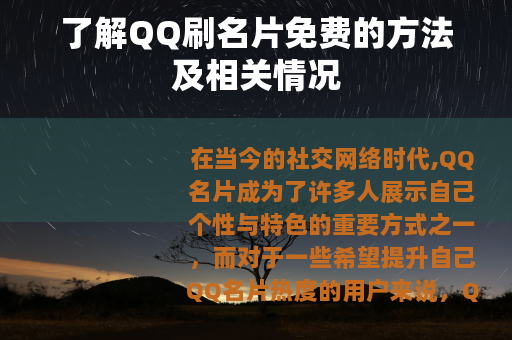 在当今的社交网络时代,QQ名片成为了许多人展示自己个性与特色的重要方式之一,而对于一些希望提升自己QQ名片热度的用户来说,QQ刷名片免费的途径就备受关注。