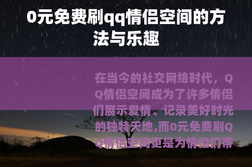 在当今的社交网络时代,QQ情侣空间成为了许多情侣们展示爱情、记录美好时光的独特天地,而0元免费刷QQ情侣空间更是为情侣们带来了额外的惊喜与乐趣。