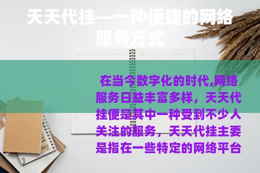 在当今数字化的时代,网络服务日益丰富多样,天天代挂便是其中一种受到不少人关注的服务,天天代挂主要是指在一些特定的网络平台或应用中,通过专业的团队或技术手段,帮助用户完成一些日常的挂机任务。