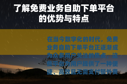在当今数字化的时代,免费业务自助下单平台正逐渐成为众多用户关注的焦点,这些平台为用户提供了一种便捷、高效且无需支付额外费用的方式来获取各种业务服务,极大地满足了人们在不同领域的需求。