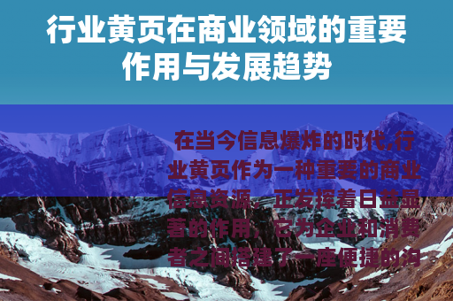 行业黄页在现代商业社会中具有极其重要的地位和作用,它是企业发展的重要助力,是消费者获取信息的便捷渠道,是产业协同发展的纽带,也是区域经济和国际贸易发展的重要推动力量,随着时代的发展和科技的进步,行业黄页将不断创新和完善,为商业世界带来更多的机遇和价值,成为推动全球经济发展的重要力量之一,我们有理由相信,在未来的日子里,行业黄页将在商业领域绽放出更加耀眼的光芒,为企业和社会创造更多的财富和福祉。