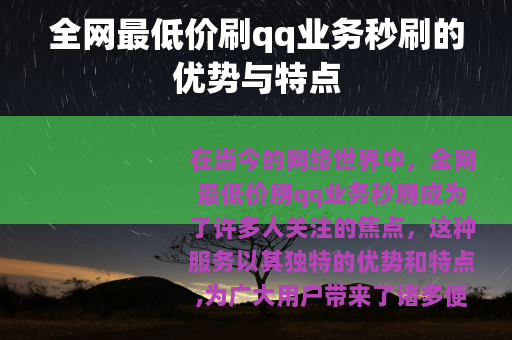 在当今的网络世界中,全网最低价刷qq业务秒刷成为了许多人关注的焦点,这种服务以其独特的优势和特点,为广大用户带来了诸多便利。