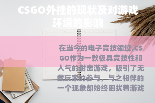 在当今的电子竞技领域,CSGO作为一款极具竞技性和人气的射击游戏,吸引了无数玩家的参与,与之相伴的一个现象却始终困扰着游戏的健康发展,那就是CSGO外挂的存在。
