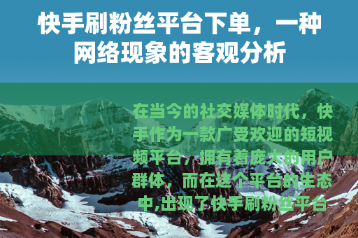 在当今的社交媒体时代,快手作为一款广受欢迎的短视频平台,拥有着庞大的用户群体,而在这个平台的生态中,出现了快手刷粉丝平台下单这样一种现象。