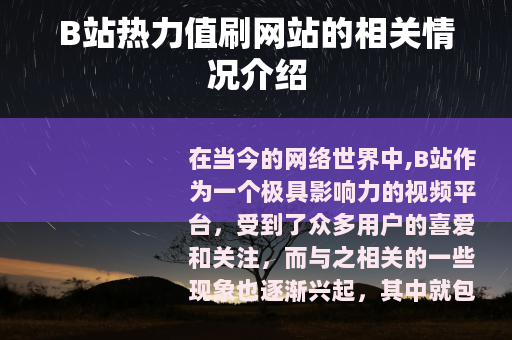 在当今的网络世界中,B站作为一个极具影响力的视频平台,受到了众多用户的喜爱和关注,而与之相关的一些现象也逐渐兴起,其中就包括B站热力值刷网站的情况。
