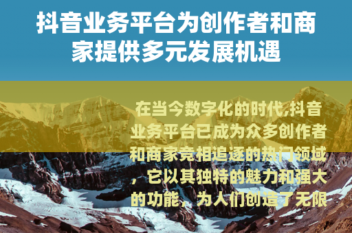 在当今数字化的时代,抖音业务平台已成为众多创作者和商家竞相追逐的热门领域,它以其独特的魅力和强大的功能,为人们创造了无限的可能,开启了一个全新的商业和创作纪元。