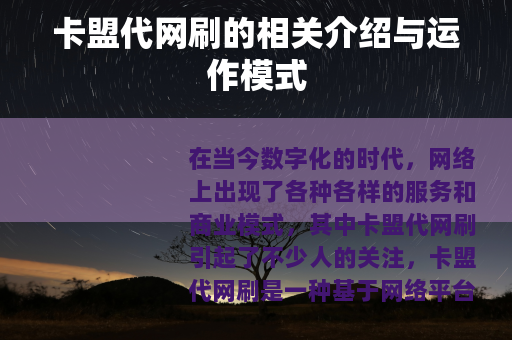 在当今数字化的时代,网络上出现了各种各样的服务和商业模式,其中卡盟代网刷引起了不少人的关注,卡盟代网刷是一种基于网络平台的服务,它为用户提供了一系列的虚拟商品交易和相关业务的代刷服务。