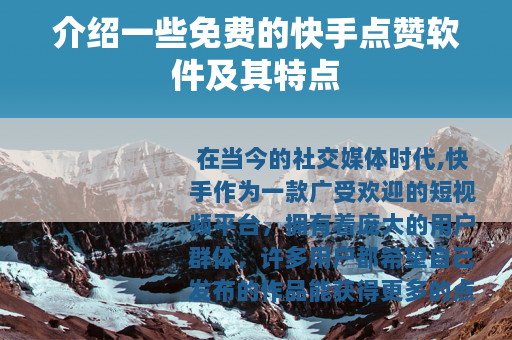 在当今的社交媒体时代,快手作为一款广受欢迎的短视频平台,拥有着庞大的用户群体,许多用户都希望自己发布的作品能获得更多的点赞,以增加作品的曝光度和人气,免费的快手点赞软件应运而生,为用户提供了一种提升点赞数的途径。