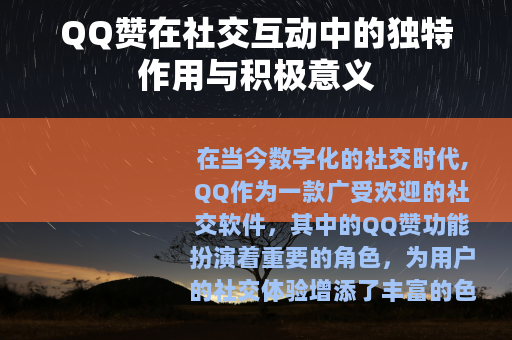 QQ赞在QQ社交生态中具有不可忽视的重要作用,它是一种简单而又强大的社交工具,通过点赞的方式,增进了用户之间的互动和情感交流,塑造了积极向上的社交氛围,激励了用户的创作热情,促进了信息的传播和筛选,它让我们的社交生活更加丰富多彩,让我们在虚拟的网络世界中,也能感受到真实的温暖和快乐,我们应该充分认识到QQ赞的积极意义,合理利用这一功能,在社交平台上传递更多的正能量,收获更多的友谊和快乐,让我们继续用点赞的方式,为彼此的生活增添一抹亮丽的色彩,共同营造一个更加美好的社交空间。