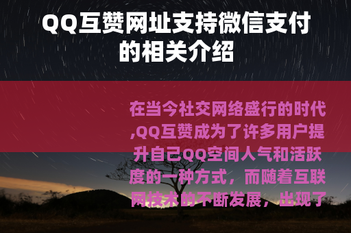 在当今社交网络盛行的时代,QQ互赞成为了许多用户提升自己QQ空间人气和活跃度的一种方式,而随着互联网技术的不断发展,出现了一些提供QQ互赞服务的网址,并且其中部分网址还支持微信支付,为用户带来了更多的便利。