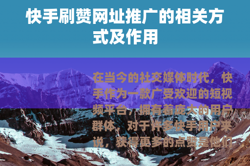 在当今的社交媒体时代,快手作为一款广受欢迎的短视频平台,拥有着庞大的用户群体,对于许多快手用户来说,获得更多的点赞是他们所期望的,这不仅能增加作品的曝光度,还能提升自己在平台上的影响力,而快手刷赞网址推广也因此应运而生。