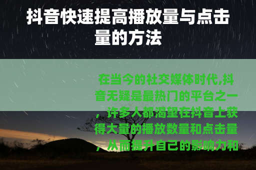 在当今的社交媒体时代,抖音无疑是最热门的平台之一,许多人都渴望在抖音上获得大量的播放数量和点击量,从而提升自己的影响力和知名度,抖音怎样才能快速提高播放数量和点击量呢?以下是一些实用的方法。 质量是关键,要确保你的视频具有独特性和吸引力,可以从自身的兴趣、特长出发,创作一些与众不同的内容,比如有趣的生活小窍门、精彩的才艺表演、感人的故事分享等等,只有当你的视频能够真正引起观众的兴趣,他们才会愿意花时间观看,并且有可能分享给更多的人,进而提高播放量和点击量。