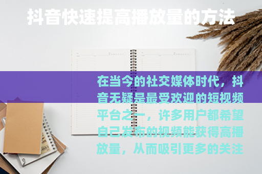 在当今的社交媒体时代,抖音无疑是最受欢迎的短视频平台之一,许多用户都希望自己发布的视频能获得高播放量,从而吸引更多的关注和粉丝,抖音怎样才能快速提高播放速度视频呢?以下是一些实用的方法。 是关键,要确保你的视频内容具有吸引力和独特性,可以从热门话题入手,结合自己的风格和特长,制作出有趣、有用或有情感共鸣的视频,如果你擅长烹饪,那么可以制作各种美味菜肴的制作过程视频,分享一些独特的烹饪技巧和心得,这样能吸引到众多美食爱好者的关注。