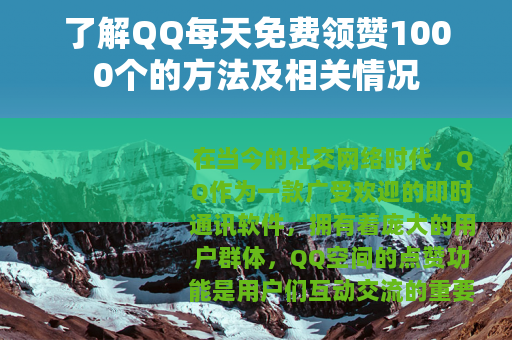 在当今的社交网络时代,QQ作为一款广受欢迎的即时通讯软件,拥有着庞大的用户群体,QQ空间的点赞功能是用户们互动交流的重要方式之一,很多人都希望自己在QQ空间发布的动态能够获得更多的点赞,以展示自己的人气和魅力,而现在有一种说法是可以每天免费领赞1000个,这无疑引起了众多QQ用户的关注。