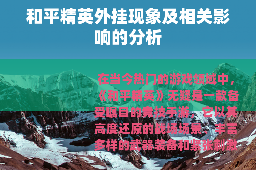 在当今热门的游戏领域中,《和平精英》无疑是一款备受瞩目的竞技手游,它以其高度还原的战场场景、丰富多样的武器装备和紧张刺激的对战模式,吸引了大量玩家投身其中,在游戏世界里展开激烈的角逐,伴随着游戏的火爆,一个不容忽视的问题也逐渐浮现出来,那就是和平精英外挂的存在。